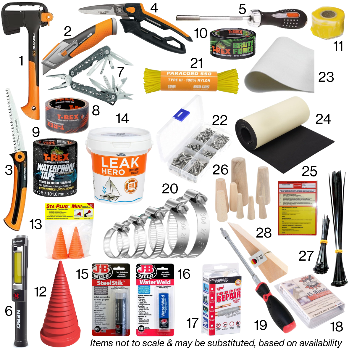 Contained within a high-visibility, IP67 waterproof case, the kit includes the following 28 marine emergency damage control & repair items: